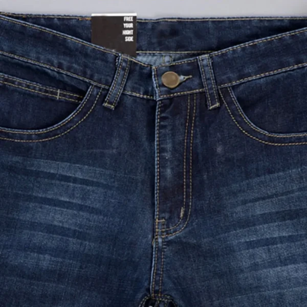The fabric is meticulously woven with a striped texture, giving it a unique touch while maintaining the solid, classic blue hue that pairs effortlessly with any outfit. With practical pocket decorations, a zipper fly closure, and light-washed detailing, these jeans combine the essence of casual elegance with a hint of ruggedness.