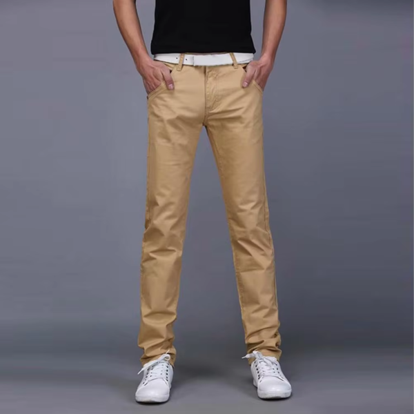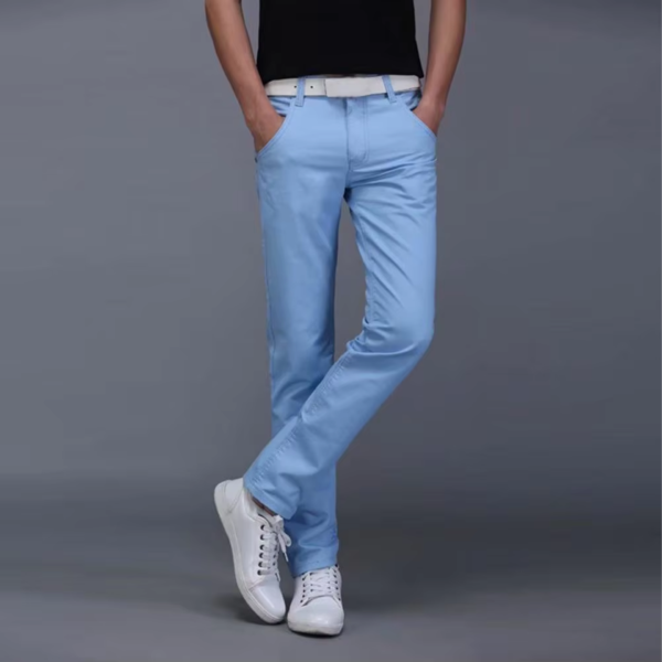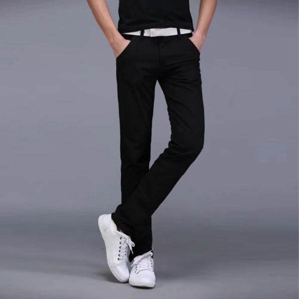 These stretch skinny chinos are crafted from high-quality polyester, offering a midweight feel that’s ideal for autumn. With a mid-rise waist and a button fly closure, they feature a slim, straight-leg fit that accentuates your legs, making you look sharp and sleek.