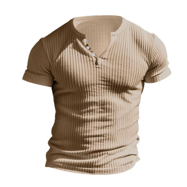 Introducing the Striped Classic Button Tee stylish and lightweight addition to your spring and summer wardrobe. Designed for the modern man, this t-shirt features a sophisticated striped texture that effortlessly blends casual comfort with a touch of elegance.